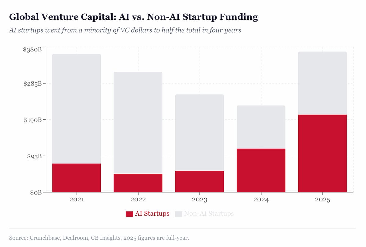 Venture capital continues to pour enormous sums into the sector, with Crunchbase data indicating that about 90% of venture funding in February went to AI startups, and two companies, OpenAI and Anthropic, captured roughly 74% of that capital.